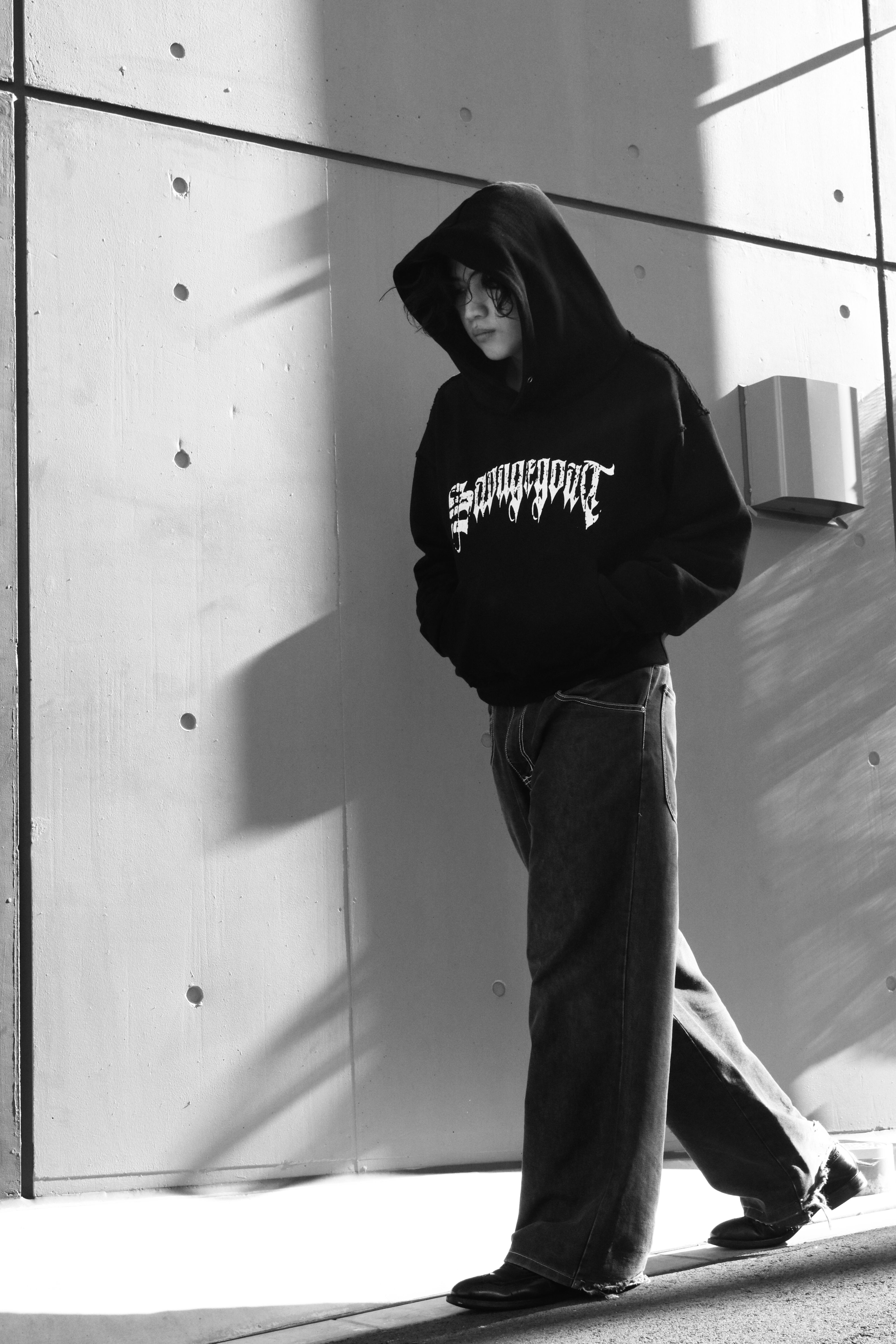 深く落ちる大きめのフードは、